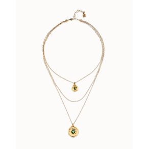Collar triple bañado en oro 18k con charms de ojo y cristal facetado verde
