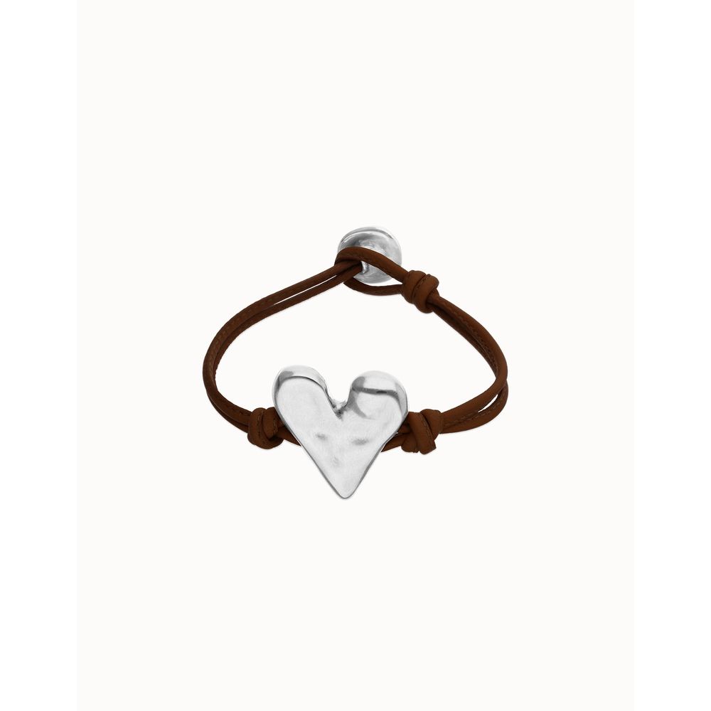 Pulsera mezcla de hilo efecto seda con cuero marrón y detalle de corazón plateado