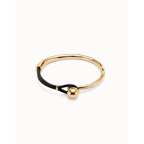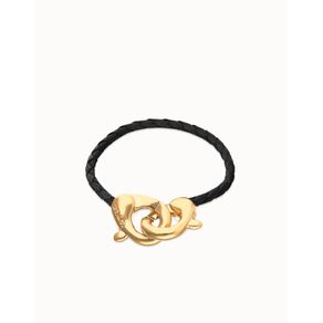 Pulsera de cuero negro de hombre y detalle de mosquetón entrelazado dorado